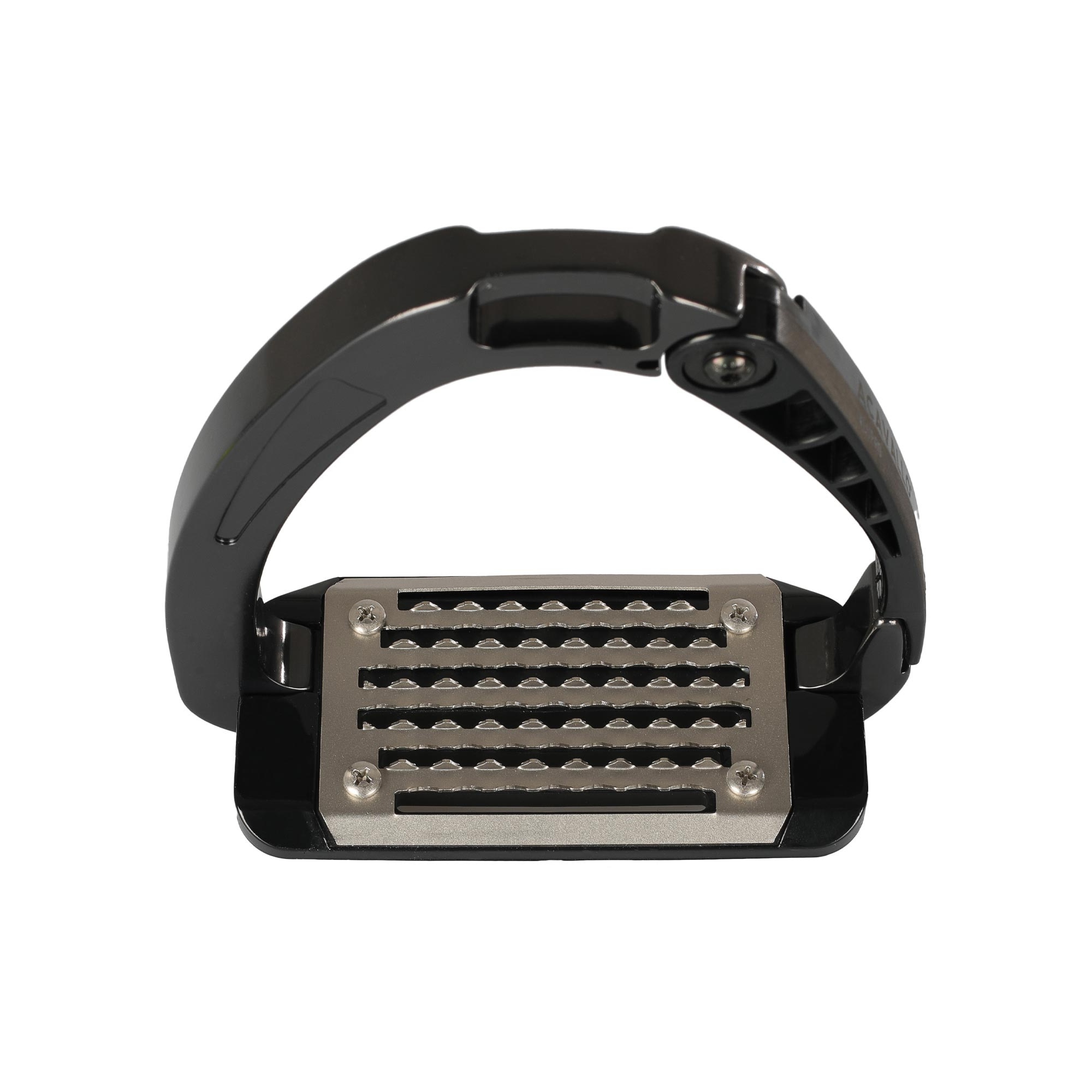 The stirrup is crafted from an advanced combination of anodized aluminum, stainless steel, and flexible polymers. The sturdy aluminum arch ensures stability, while the moving polyamide arm provides flexibility and less rigidity compared to traditional stirrups.