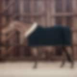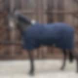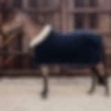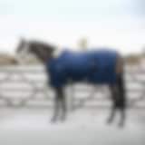 Brun häst framför ridbana med ett marinblått Kentucky Stable Rug 400 gr