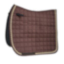 This dressage saddle pad is in a beautiful brown color with large quilting and two pipings, one in gold and one in brown/gold glitter/white. The edging that runs along the entire saddle pad is navy.