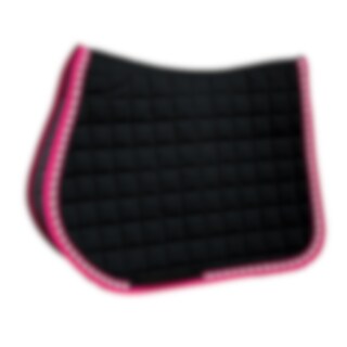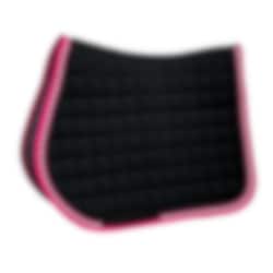 This jumping saddle pad is made of cotton with soft teddy at the withers to prevent chafing. The saddle pad is in black and has an edging in cerice and two pipings, one in black/silver/white and one in cerice.