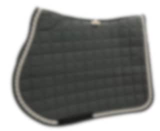 The jumping saddle pad is made of cotton with soft teddy at the withers to prevent chafing. This saddle pad has a nice grey colour with two spinners, one in silver glitter and one in black, silver and white.