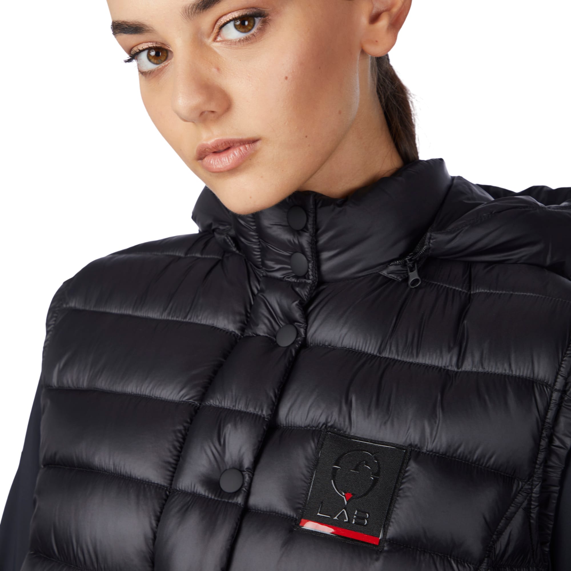 The vest is lined with lightweight, insulating ecodown padding, offering cosy warmth while remaining comfortable and easy to wear. It features a central front zip, complemented by overlapping snap buttons for added protection against the cold. The adjustable hood adds extra functionality.