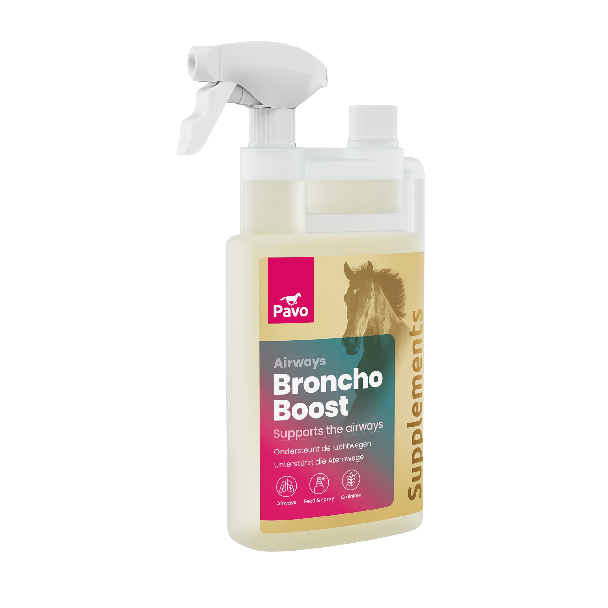 Pavo BronchoBoost 1 L är ett innovativt fodertillskott som stödjer hästens luftvägar och hals, vilket bidrar till lättare andning och ökat välbefinnande. Produkten kan ges som del av daglig utfodring och kan även sprayas över grovfodret för en extra inhalationseffekt, vilket ger dubbel verkan för optimal luftvägsstöd.