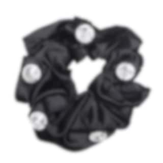 An elastic scrunchie in a satin-similar material with several slightly larger rhinestone details, from SD Design. Black