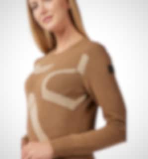 Vestrum's knitted sweater in the color Corten Beige is designed with details of a saddle, boot, horseshoe, and stirrup in a lighter beige shade. The sweater is made from a soft, warming material suitable for cooler weather. On one arm, there is Vestrum's classic logo in leather.
