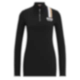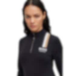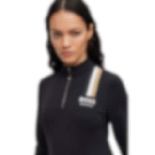 The shirt is tailored with a slim silhouette and features a practical zipper with a silicone logo puller backed with fabric. Boss signature stripes and subtle branding on the left side, right sleeve hem, and chest provide a refined and sporty look.
