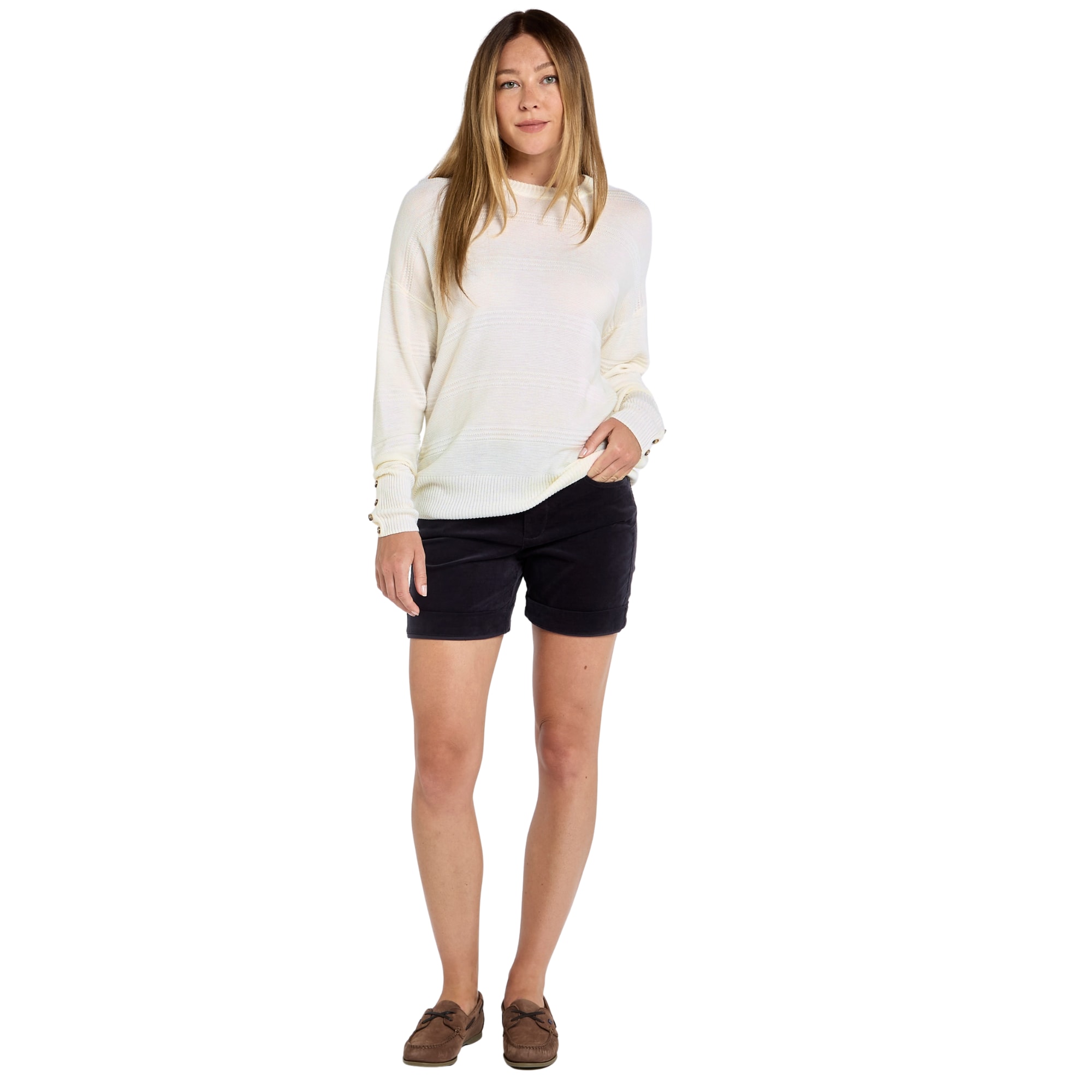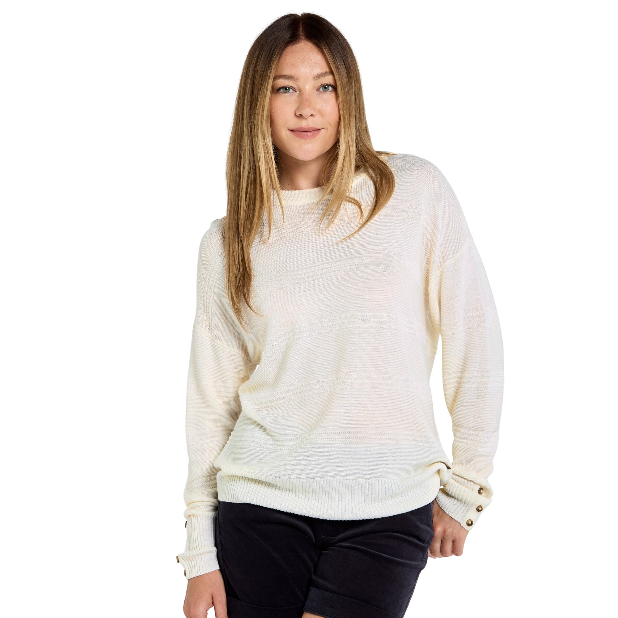 Dubarry Ashfield is a classic knitted sweater with a crew neckline, designed with a relaxed fit and dropped shoulders for a modern silhouette. The Ashfield knit features buttoned cuffs and subtle textured stripes running throughout the garment.