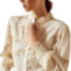 Cricklade Blouse is a light and silky blouse with ruffles that adds elegance to any look. The blouse is in a light tone with beautiful horse prints. The ruffles are shaped around the neck, buttoning and at the cuffs and create a very elegant look. This blouse is a useful garment that is just as suitable for everyday wear as it is for parties, or why not when you want to look extra nice in the saddle.