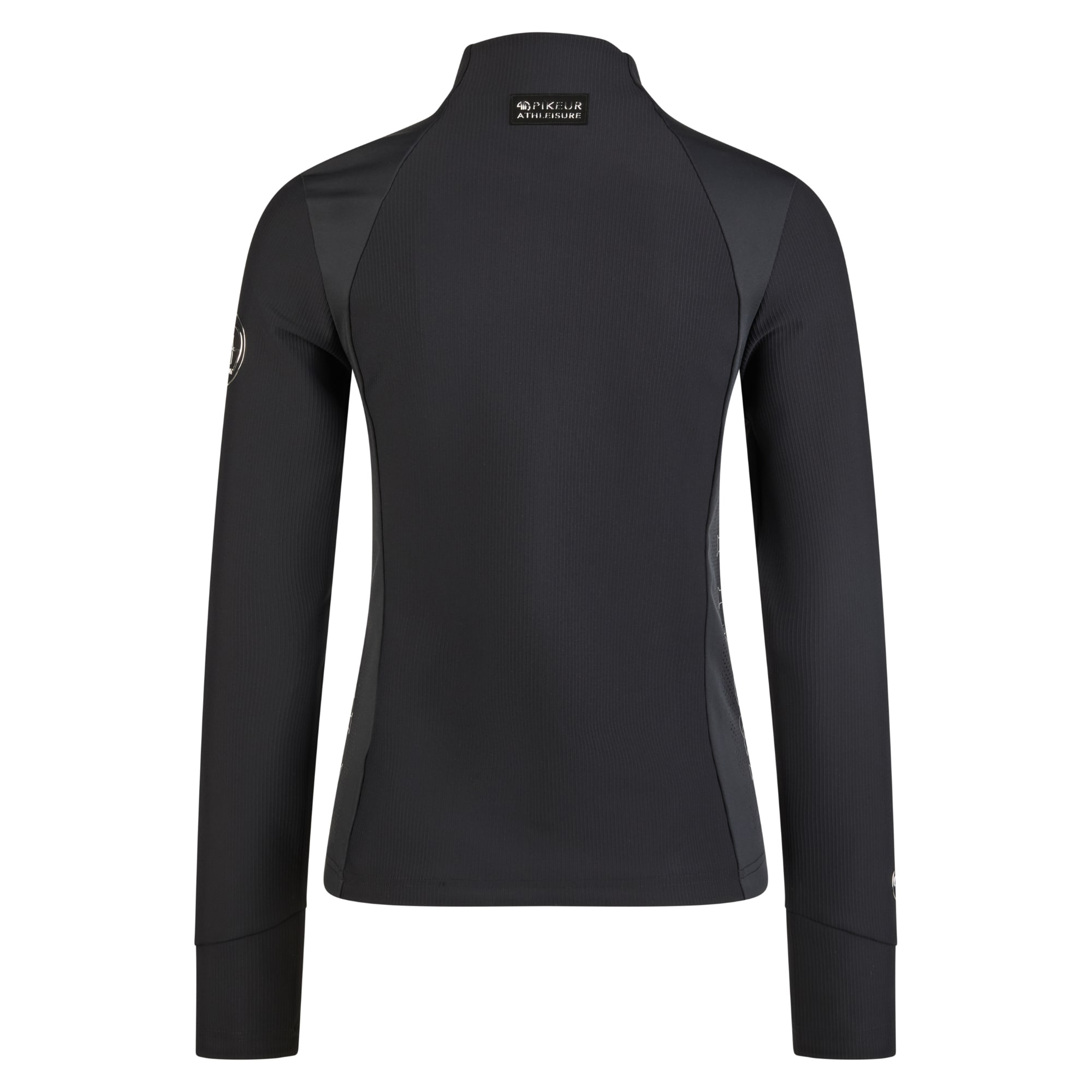 The top is closed with a two-way front zipper and features a decorative zipper pull. Side pockets with zippers provide practical storage. At the front of the collar, Pikeur Athleisure perforation adds a technical detail. The design is clean, with a glossy silicone-printed logo on the sleeves, side panels, and on a label at the back of the neck.