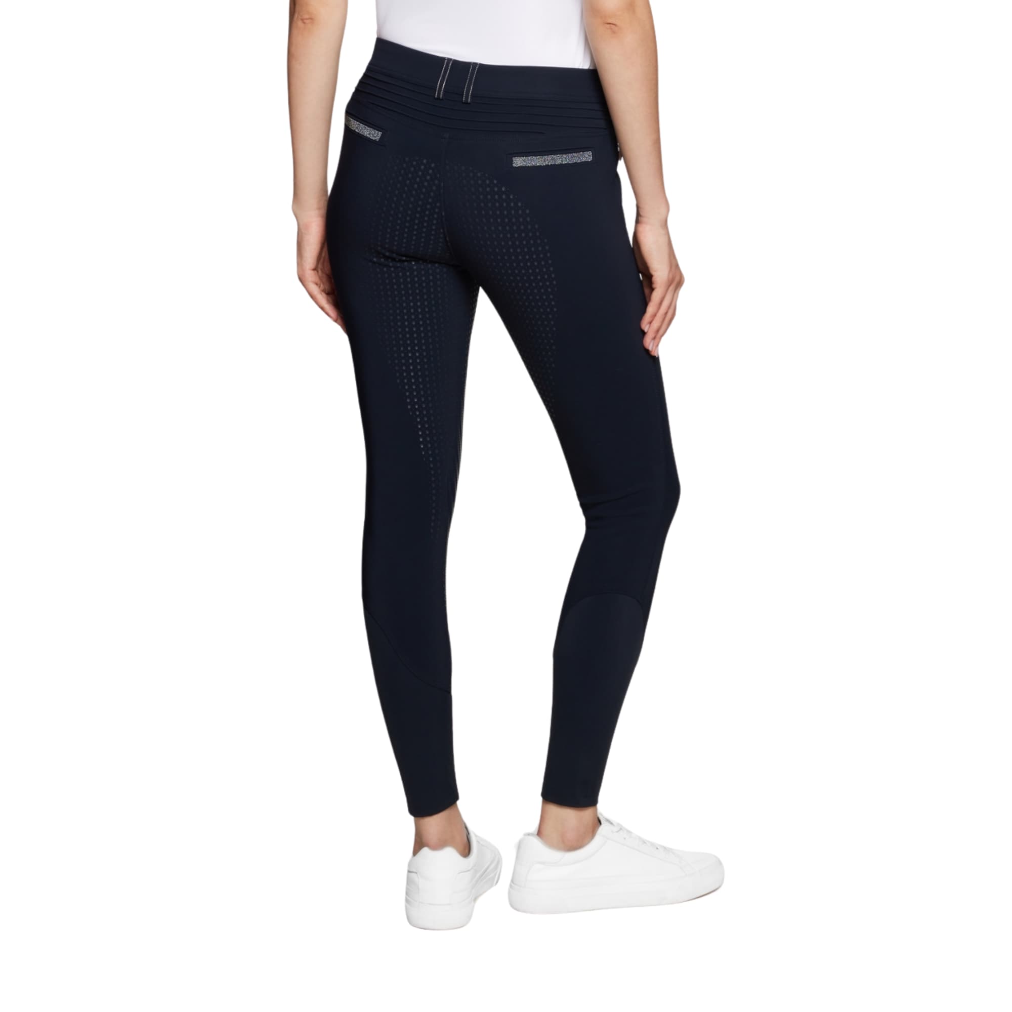 Navy Samshield Diane women’s breeches in a flexible, stretch technical fabric, featuring elegant Swarovski crystals on the back pockets.