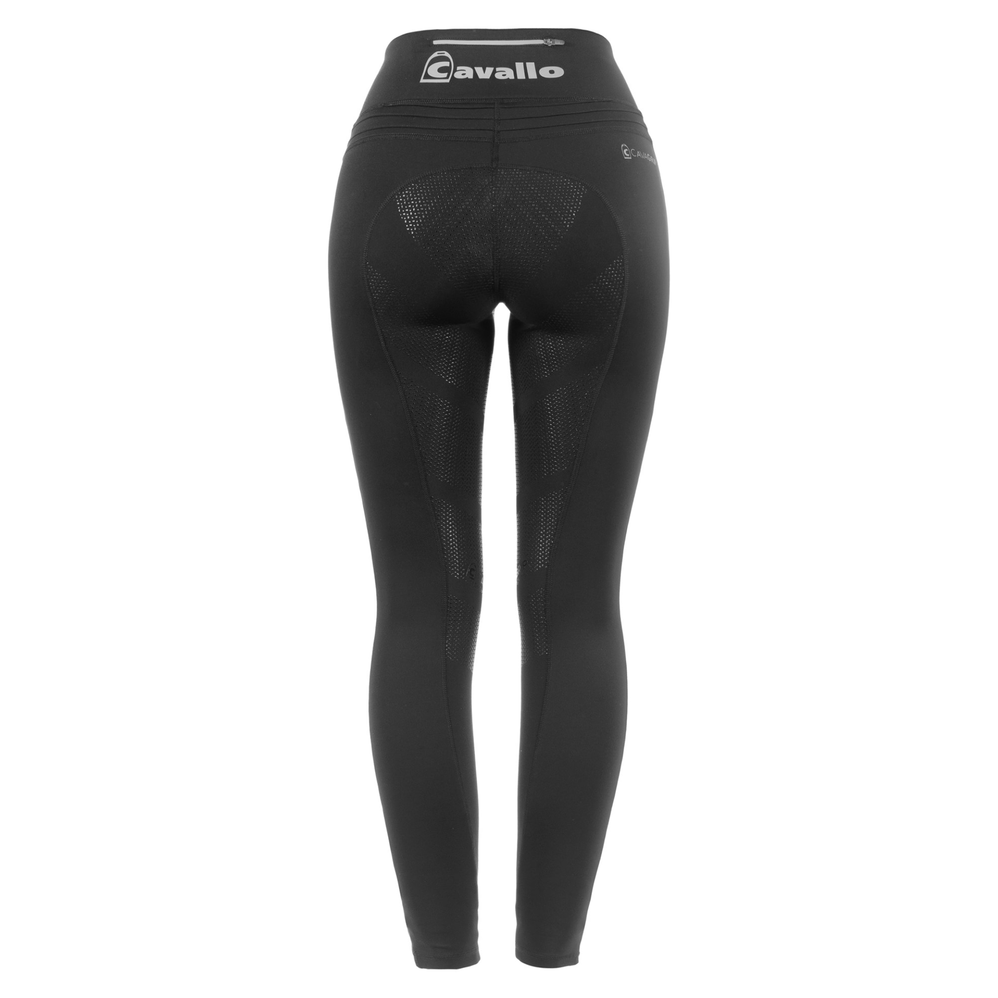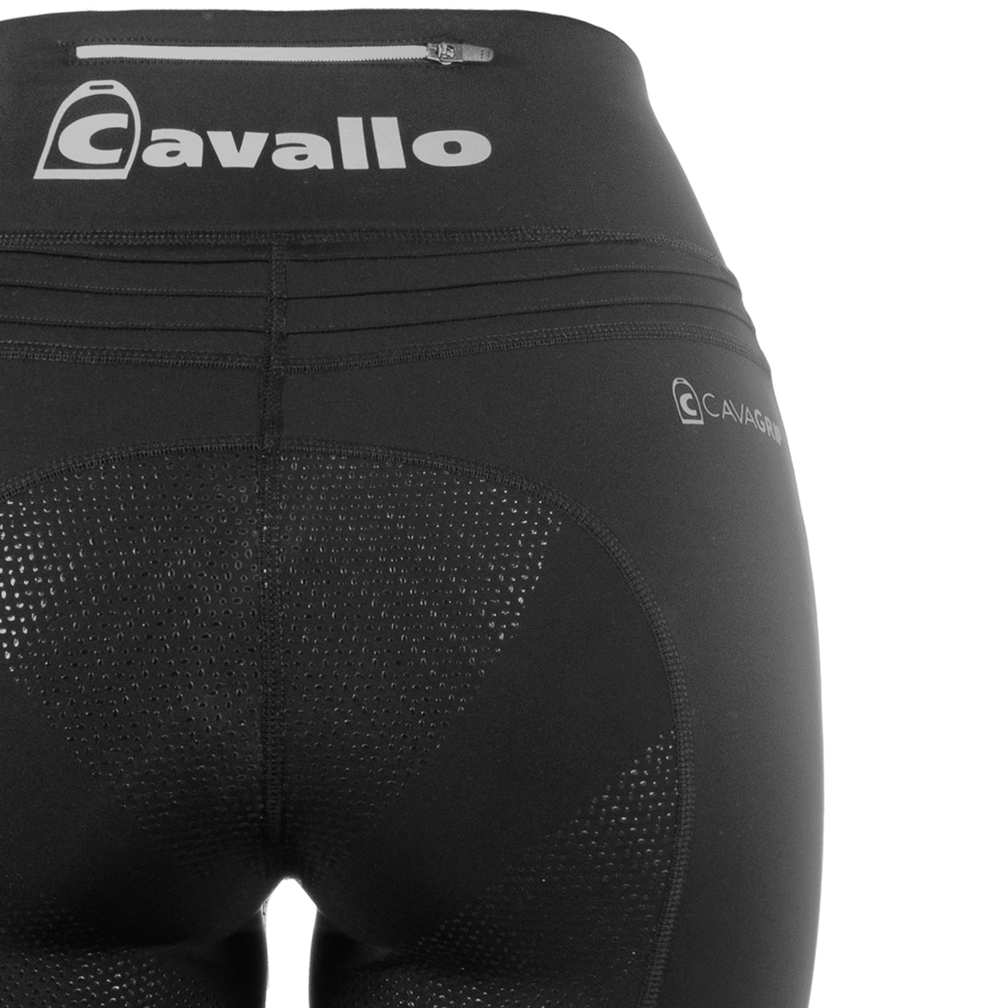 The tights are equipped with two phone pockets on the thighs, one of which is finished with a high-shine Cavallo badge. At the back of the waistband, there is a larger Cavallo logo and a detailed zip pocket.