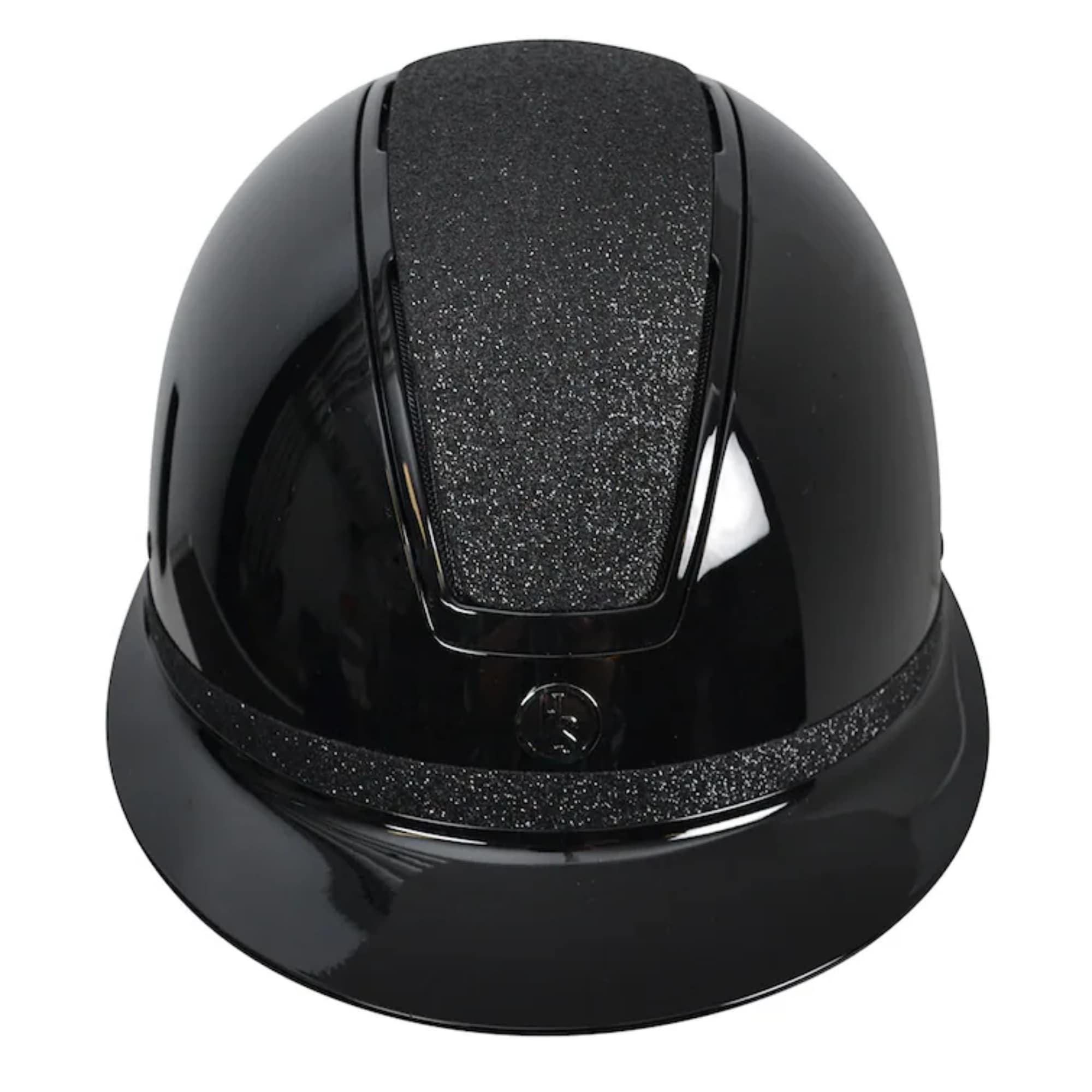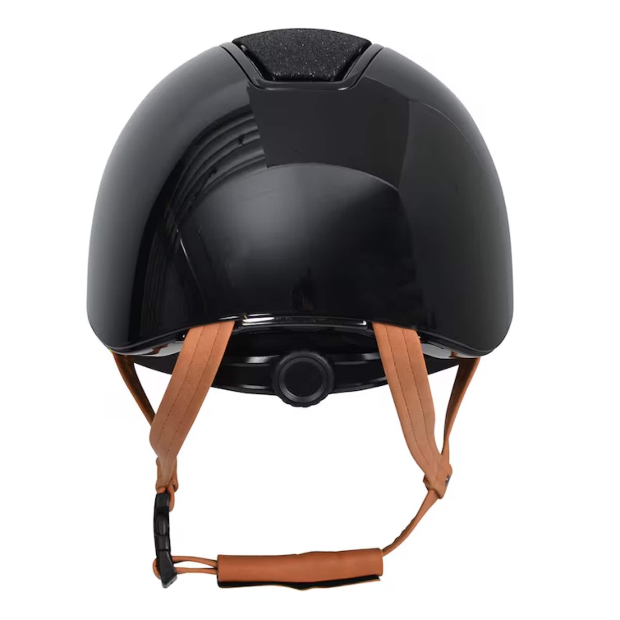 An elegant helmet from Hansbo Sport featuring the Multi-directional Impact Protection System (MIPS). The helmet comes with a visor, six ventilation openings, and a chin strap with three-point fasteners in brown synthetic leather with a quick-release buckle, as well as a soft lining for maximum comfort. It has a glossy finish with panel details in sparkling glitter and a beautiful glitter band around the visor.