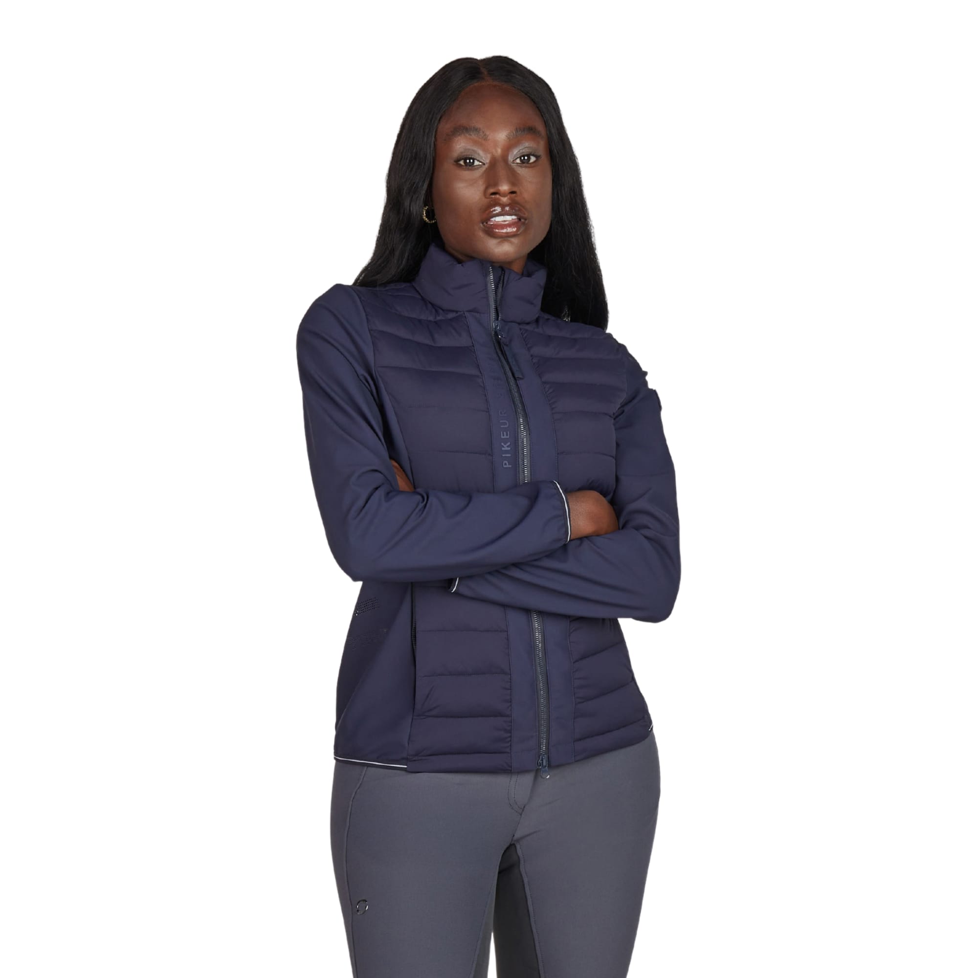 A Pikeur silicone logo is placed on the sleeve. The jacket is tested and certified for compatibility with airbag vests.
