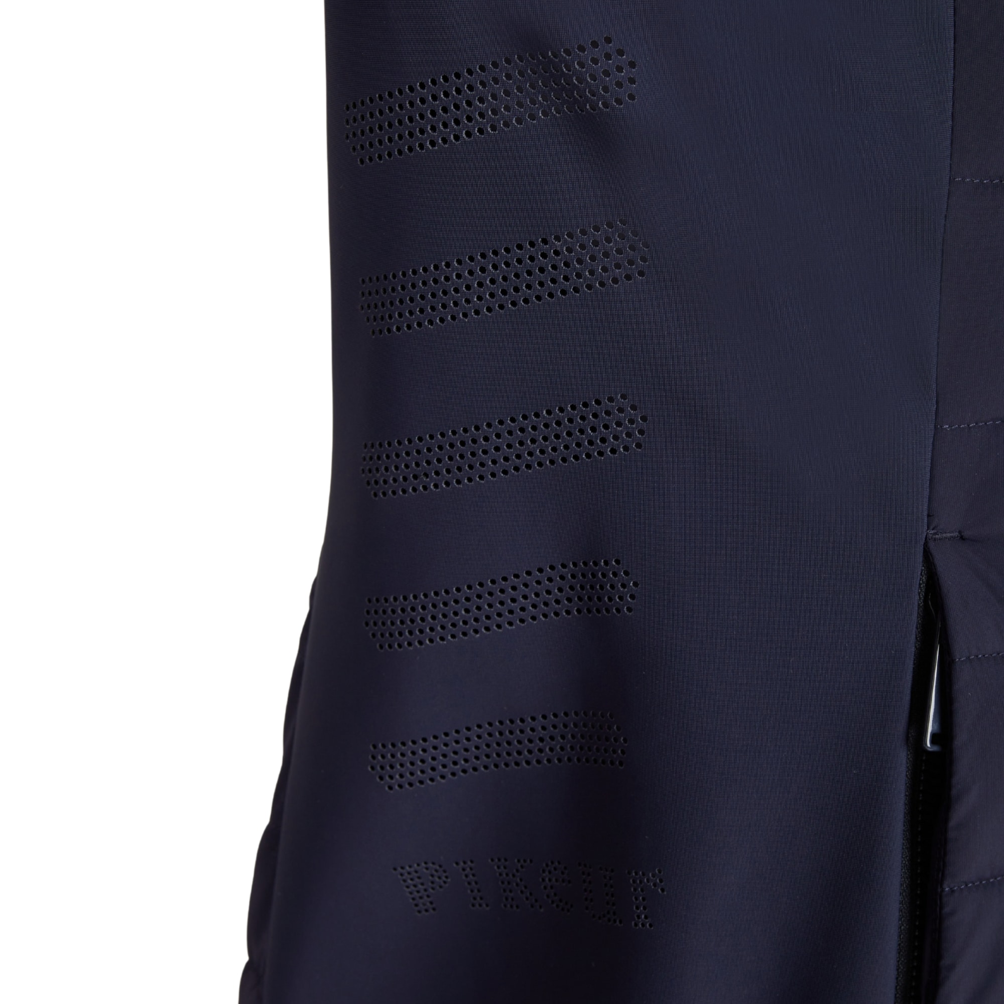 The Pikeur hybrid jacket features front and back panels made of 4-way stretch, along with softshell side panels with laser-cut details that enhance ventilation. The material combination makes the jacket both wind-resistant and water-repellent while maintaining flexibility and comfort.