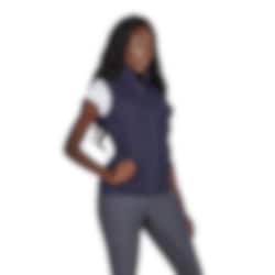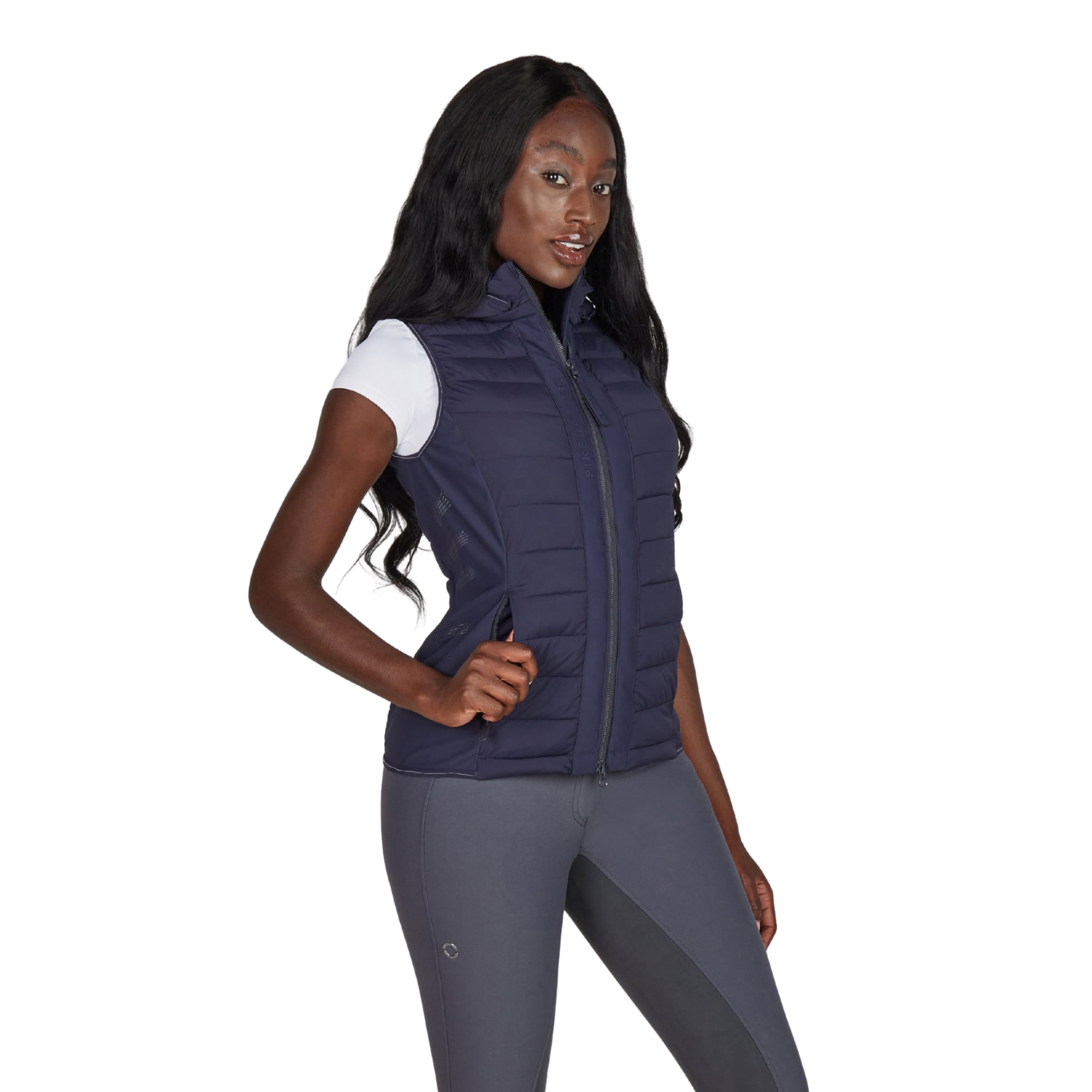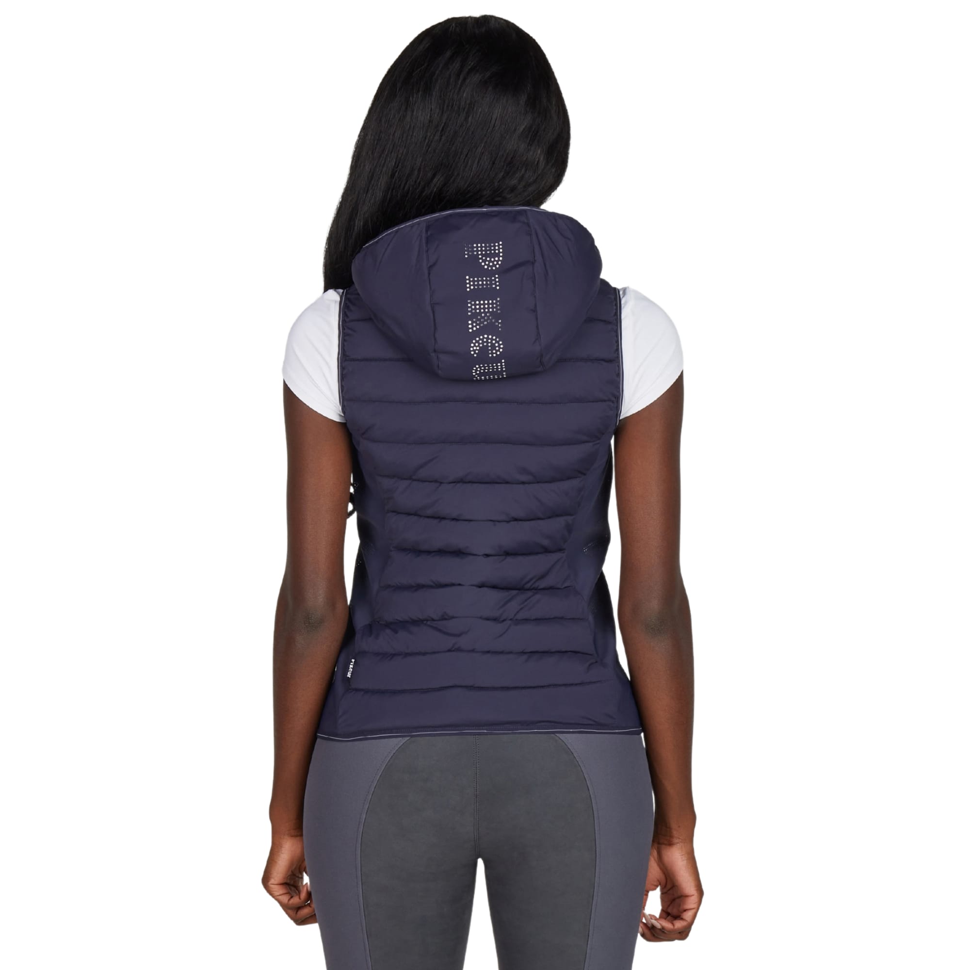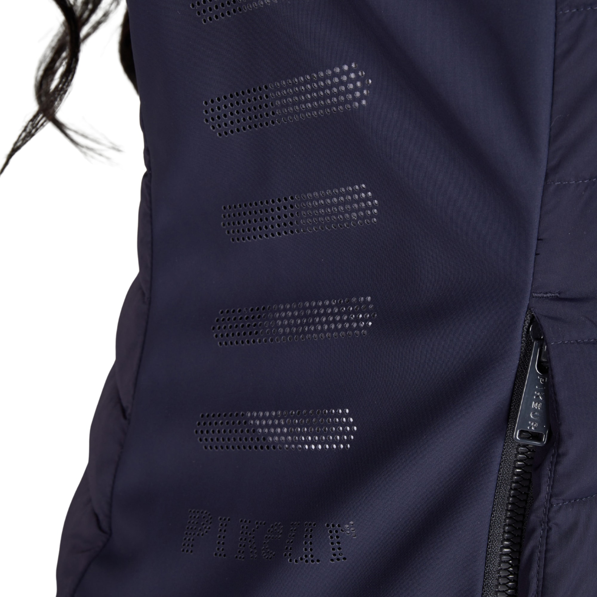 Västen stängs med tvåvägsdragkedja framtill och har dolda sidofickor med dragkedja för ett rent helhetsintryck. Fållar och kanter är avslutade med kantband med Pikeur-tryck ton-i-ton. På insidan finns ett tryck med pictogram som beskriver västens funktionella egenskaper.