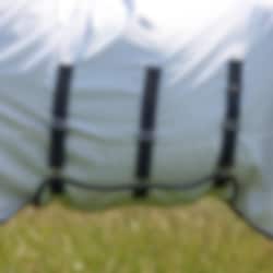 The rug features an integrated neck with ear holes and a large tail flap that helps keep the body, neck, dock and poll covered. The durable and breathable fabric allows airflow while helping protect against sunburn and bleaching. The belly flap provides coverage underneath, and deep shoulder gussets allow good freedom of movement. The rug fastens at the chest with buckles and has an adjustable fillet strap as well as attachment points for leg straps.