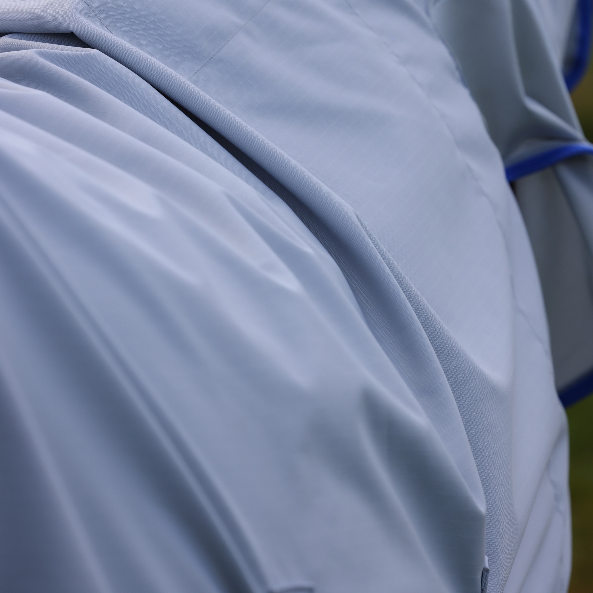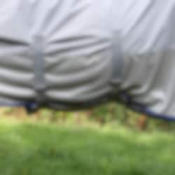 The rug features a waterproof upper in durable 600 denier ripstop with a waterproof rating of 3000 mm, allowing rain to run off. The quick-drying mesh side panels allow airflow and provide good ventilation, with a breathability rating of 3000 g/m². The rug fastens at the chest with buckles, has a fixed neck cover, an adjustable fillet strap and a large tail flap. The material also provides protection from the sun’s rays with up to 90% UV protection.