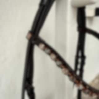 The Florenz bridle is crafted from black, smooth leather with black padding. The browband is beautifully curved and adorned with Rivoli XS stones (8 mm), alternating between Jet Hematite and Rose Patina. It is also decorated with brown croco patent leather and rose-coloured settings.