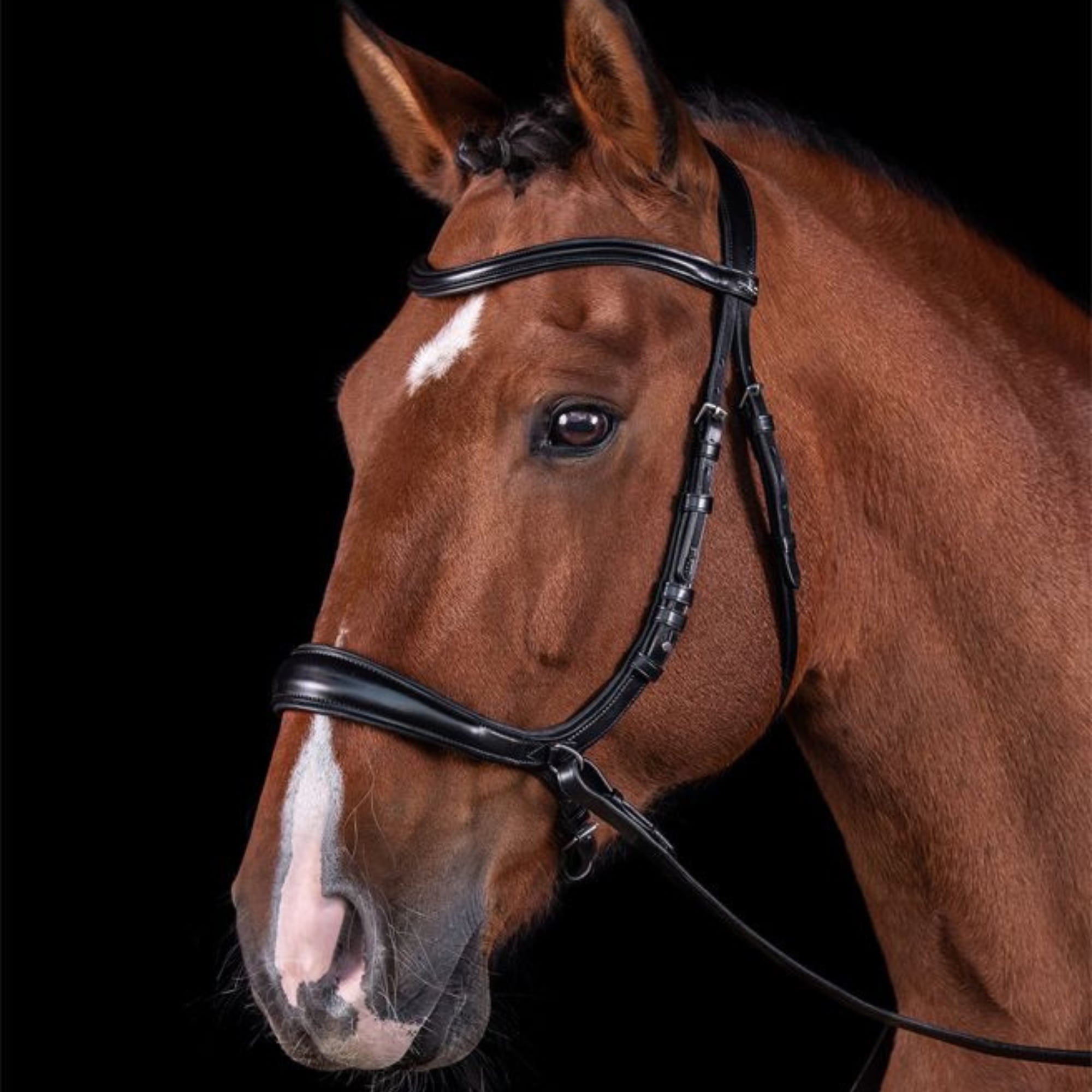 The noseband features the characteristic curved shape of the Equitus range, designed to help avoid pressure on the horse’s sensitive facial nerve. In this model the noseband is slightly wider and lightly reinforced to provide a secure fit and soft pressure distribution across the nasal bone.