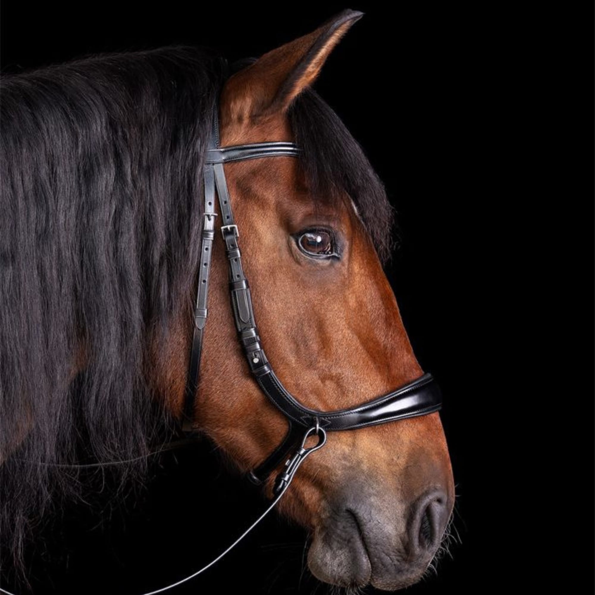 At the same time, Equitus Theta is a versatile 3 in 1 bridle. Thanks to the proven button rivets, the bridle can also be used with a regular bit by attaching cheekpieces. It is also possible to ride with two pairs of reins, where one rein is attached to the bit and the other to the D rings on the noseband. This can be a good option for sensitive horses or when introducing a horse to the bit.