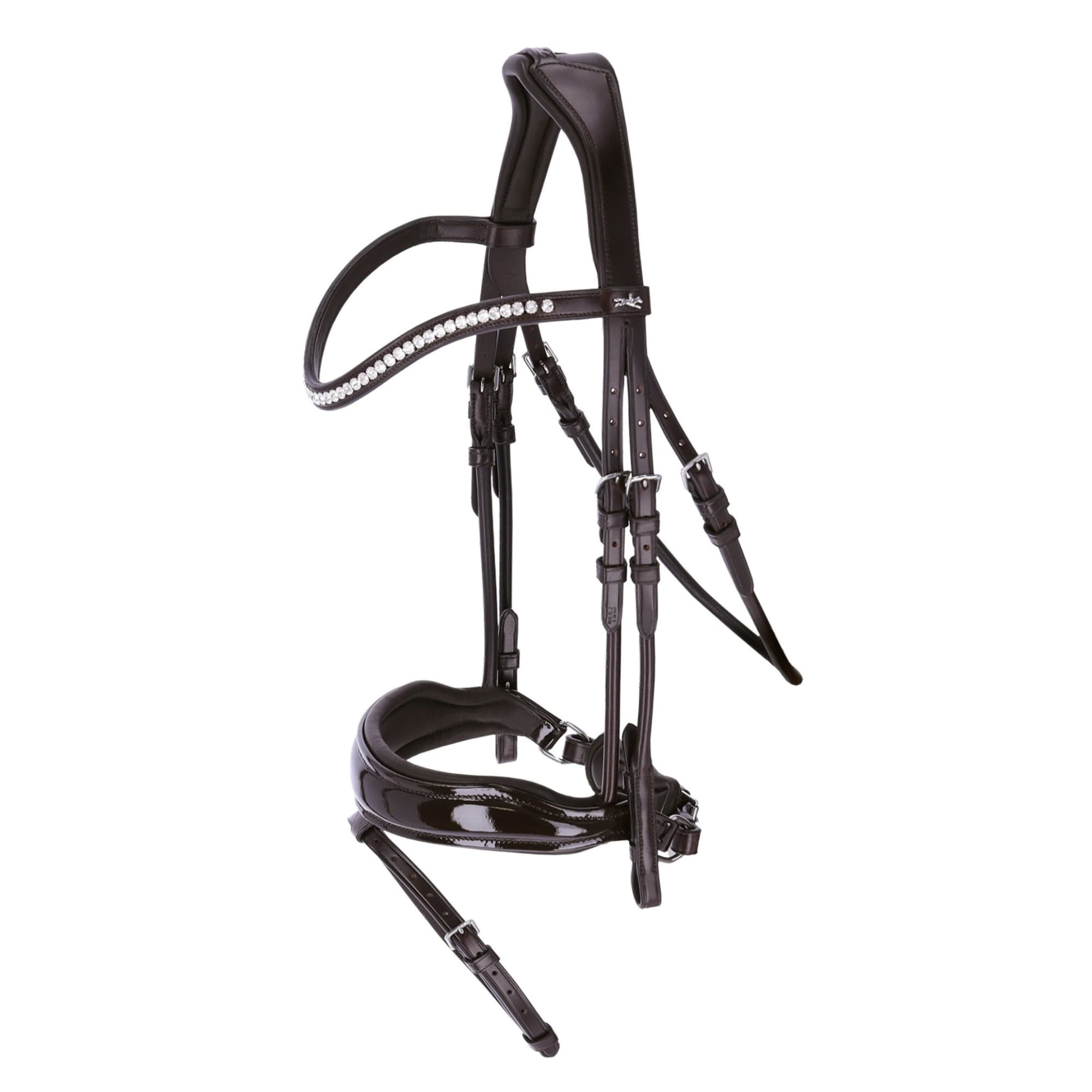 The rolled design gives the bridle a soft and elegant appearance with a classic dressage character, while the curved browband with large crystals adds an exclusive and sophisticated detail.