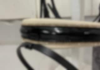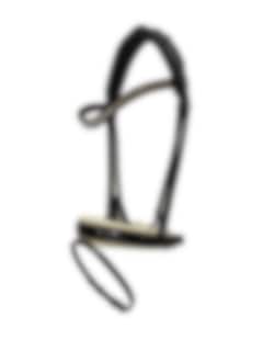 This is a black München Feel Good round-sewn bridle with the slightly wider, well-padded neck piece, which is specifically named Feel Good because it has a softer setting against the horse's neck. The noseband on this round-sewn bridle is 5 cm wide in the Comfort XS model, which means that the noseband is narrower at the sides where the horse has the least space at the bit, the closure of the noseband is pull-back. The noseband is in patent leather and has Swarovski fineline decoration, is softly padded with a light silky color that is exceptionally beautiful against a light fux or palomino.