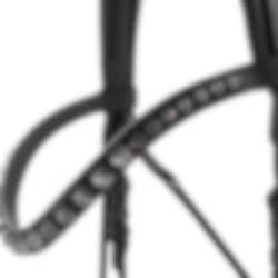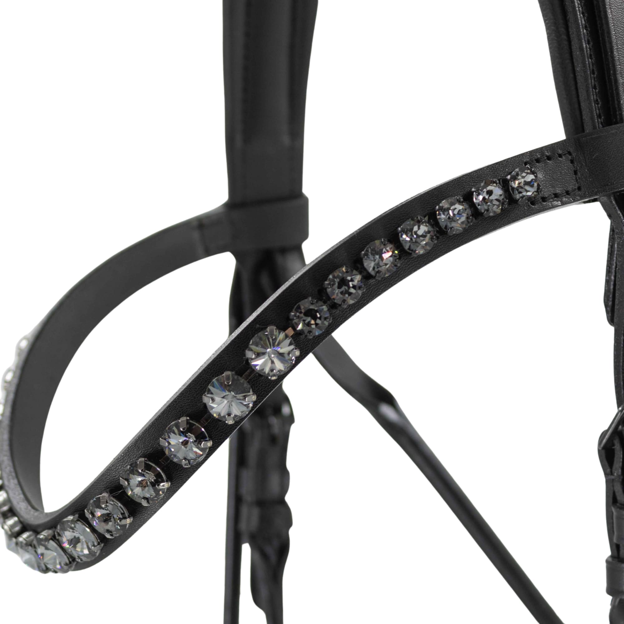 The beautiful browband is in the FOCUS model, which means it is a curved leather browband featuring large Swarovski crystals in the colour Silver Night B in different sizes. The smallest stones, measuring 8 mm, are placed at the outer edges, followed by 10 mm stones, while the centre features 12 mm stones. This distribution is another detail that makes the bridle truly unique and something that stands out from the crowd. The settings are black and match perfectly with the black buckles.
