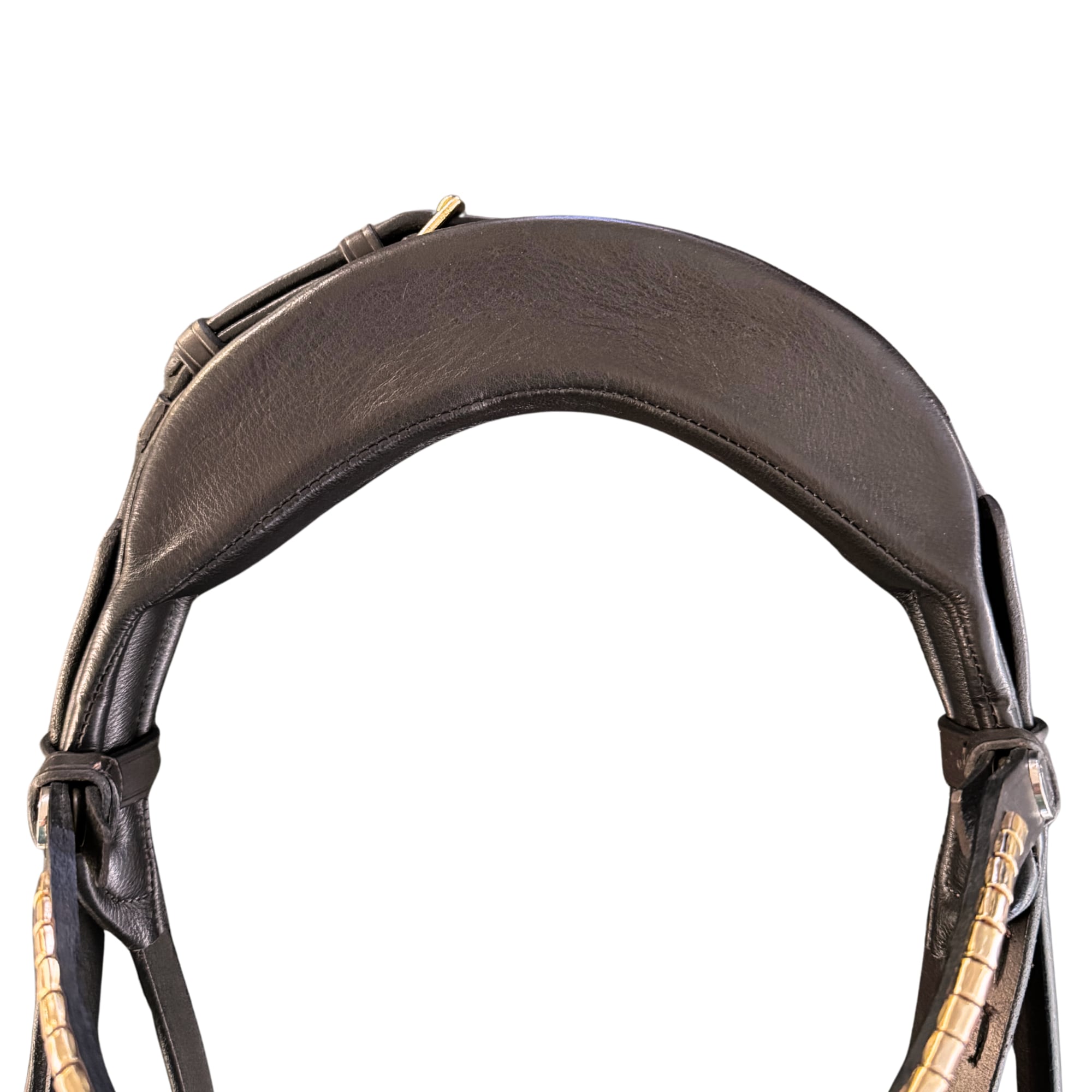 Himalaya by Finesse Bridles features brown round sewn leather, brown lining and brass buckles!