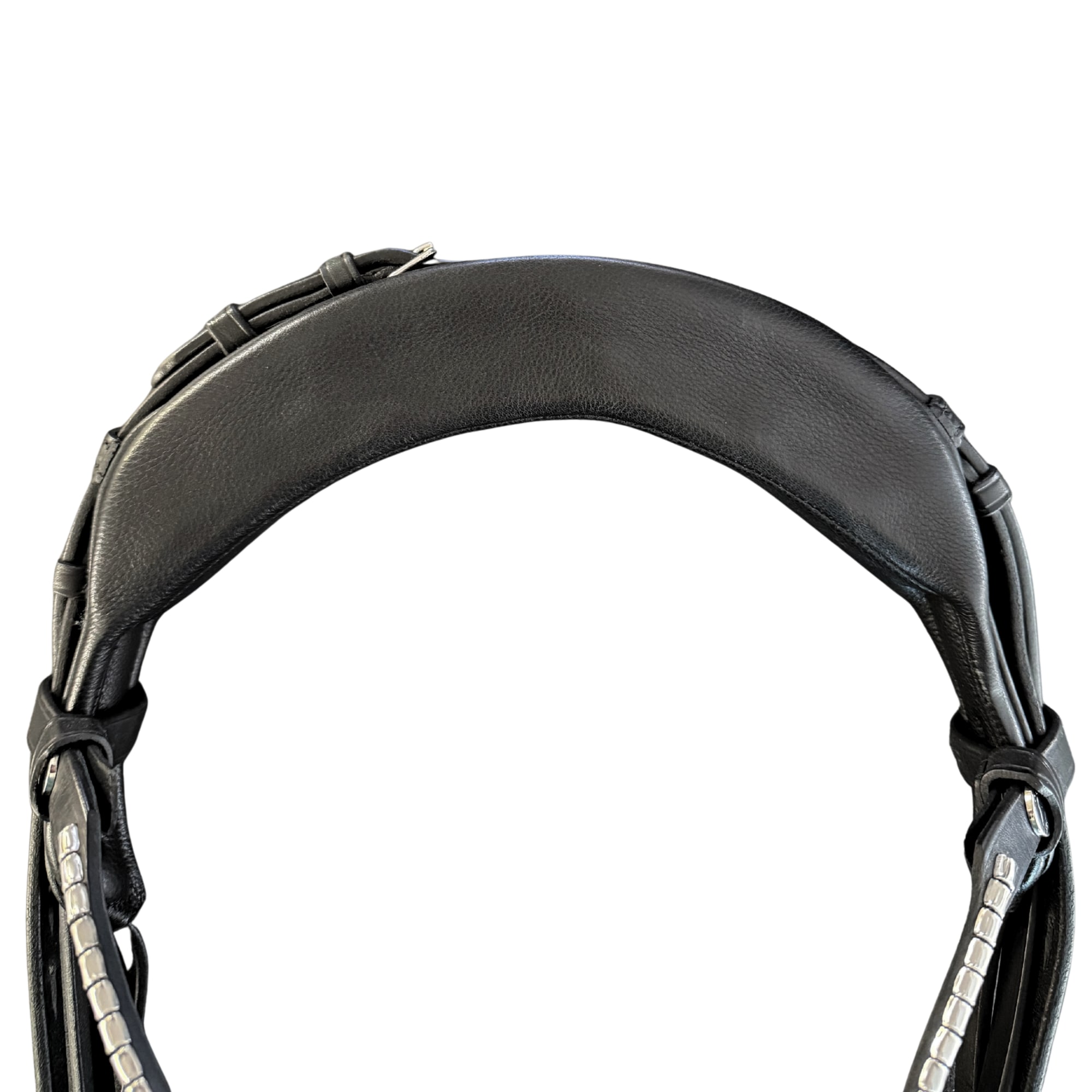 Elegant double bridle with plain leather in black, featuring black padding and silver buckles.