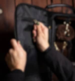 The bag's interior is lined with soft synthetic fur and equipped with an internal hanging bracket and clip to keep your bridle securely in place. Gold-colored air vents on both sides prevent moisture build-up, ensuring your bridle stays fresh. The thoughtfully designed bag also includes a zippered front pocket and multiple internal compartments, providing ample space for storing accessories.