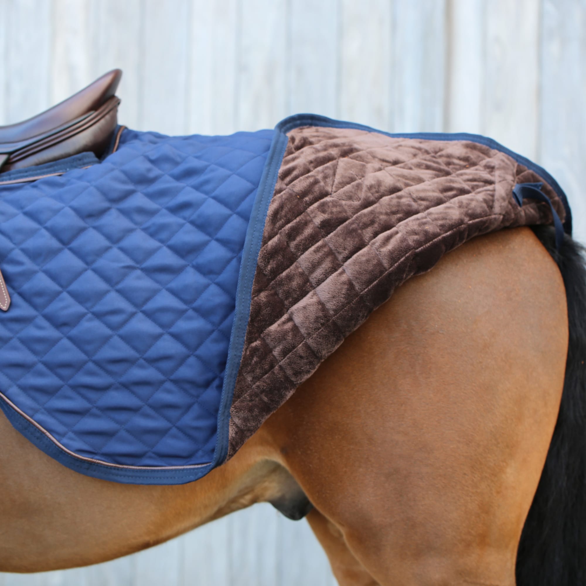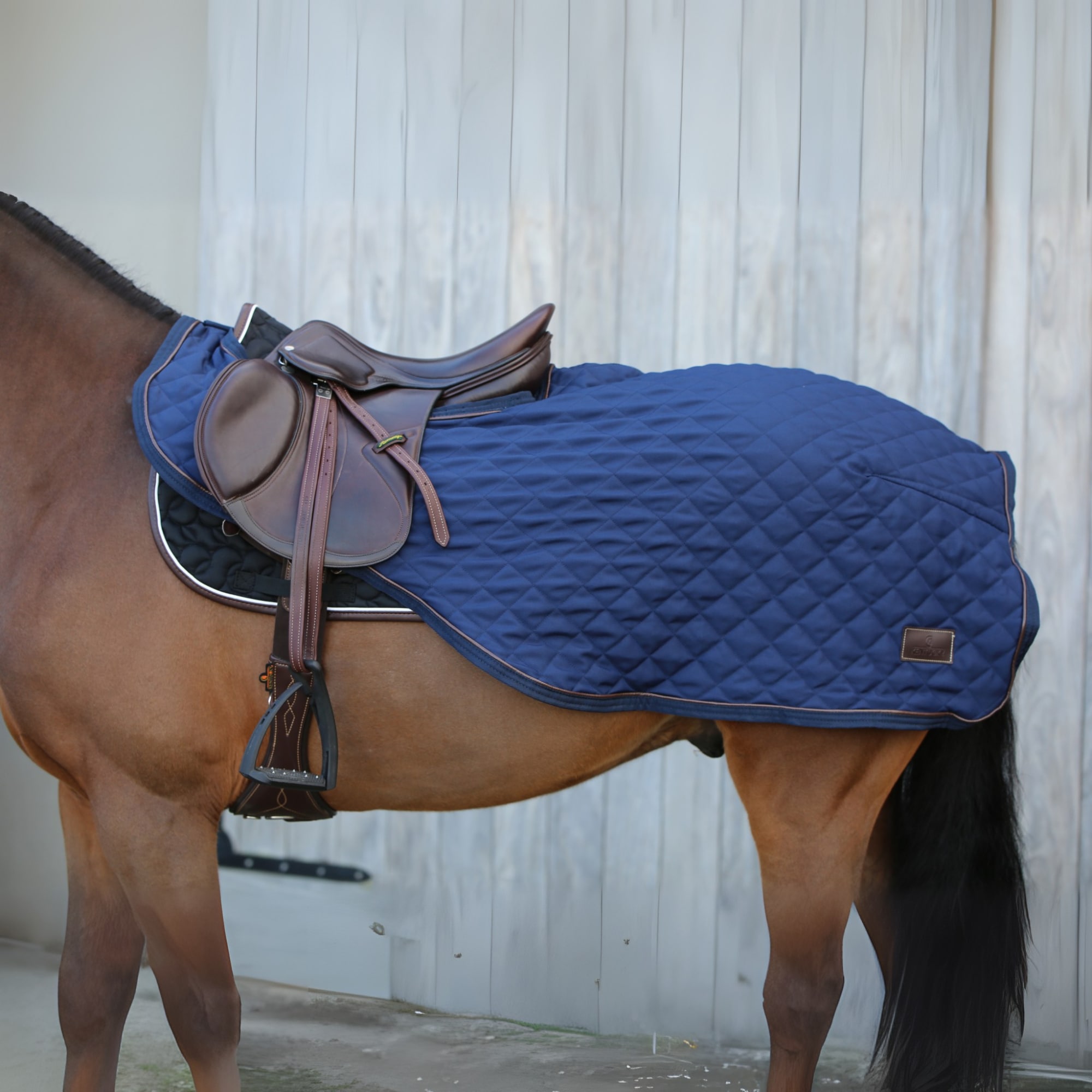The rug attaches easily in front of the saddle with a strong Velcro fastening and is kept in place with a tail strap. The classic cut covers the loins and back without interfering with leg aids. The elegant design with diamond quilting, faux leather details and the Kentucky logo gives an exclusive look suitable for both training and competition.