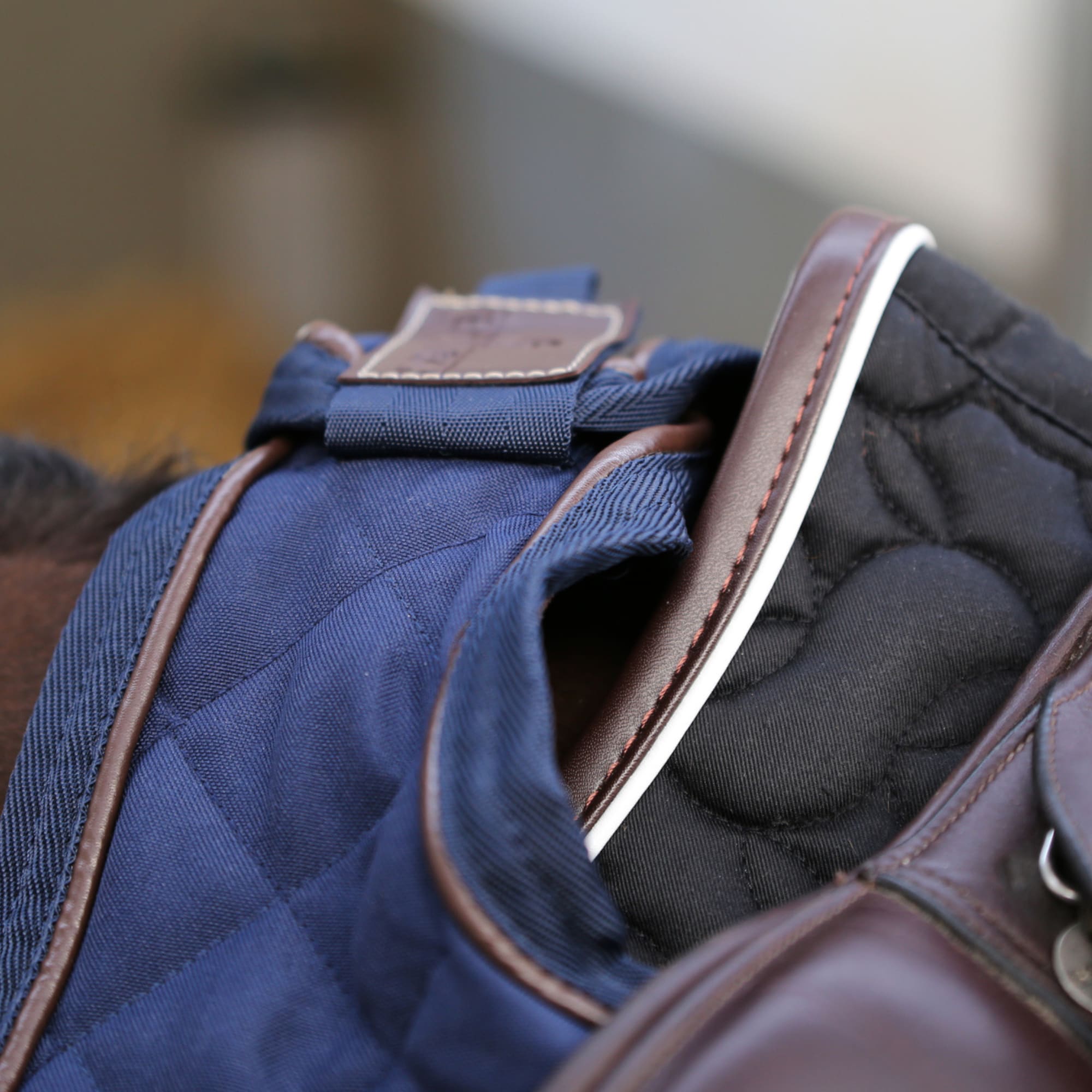 Color: Navy with brown leather details
