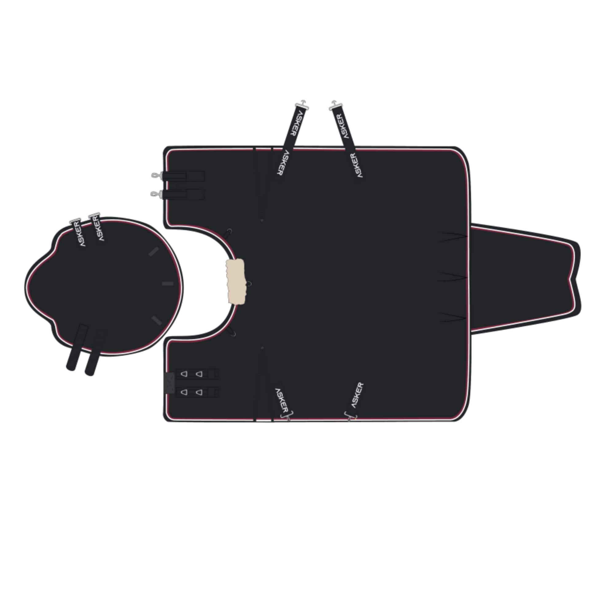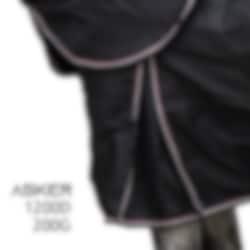 The Asker TO Plus 1200D 200g in black is a robust turnout rug designed to protect your horse against rain and wind in all seasons. The strong 1200 denier outer material makes it particularly resistant to wear, ideal for horses that are active in the field. With a waterproof rating of 3000 WP and high breathability, the rug ensures your horse stays dry and comfortable even during prolonged wet weather.