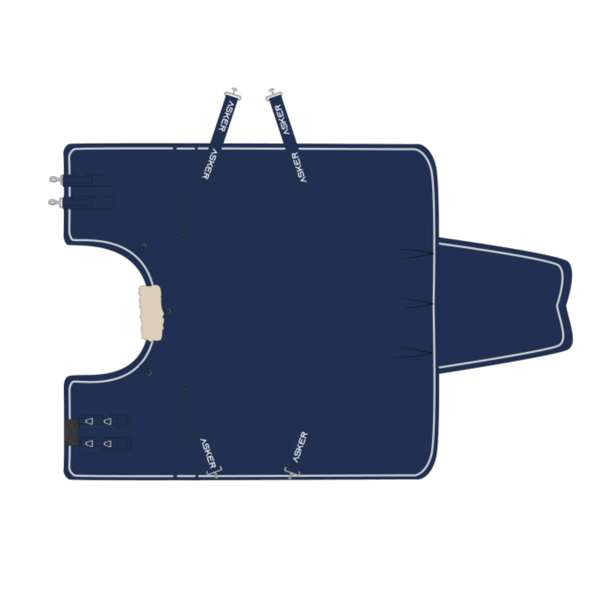 Asker Turn Out Rug SN 0g in navy is a waterproof turnout rug without a neck. The rug offers good breathability, a comfortable fit, and can be complemented with a separate neck cover.