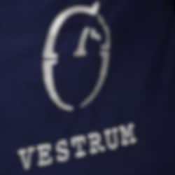 The fleece rug is navy with refined black details, including the Vestrum logo and text on the left side, giving it an exclusive and sophisticated appearance.