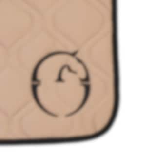 This saddle pad is beige with a black edge and logo. Perfect when you and your horse want to look extra good!