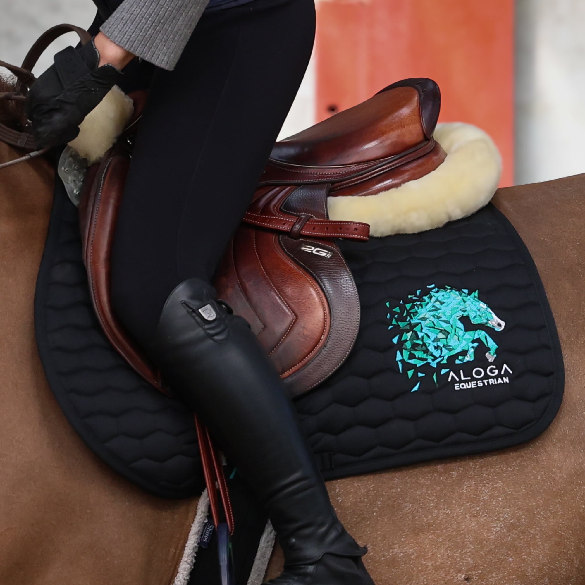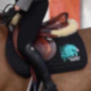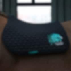 Black quilted jump saddle pad with mint Aloga embroidery.