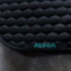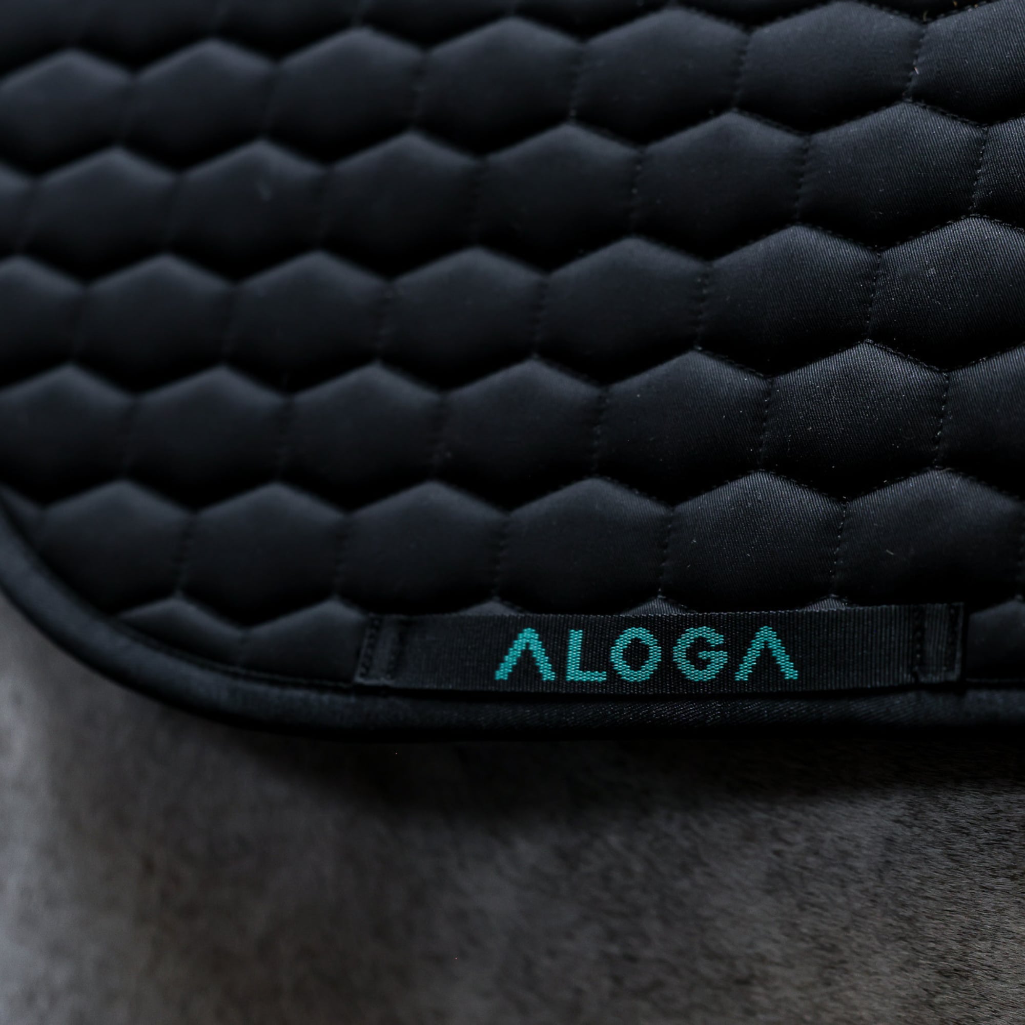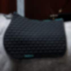 Black quilted jump saddle pad with mint Aloga logo.