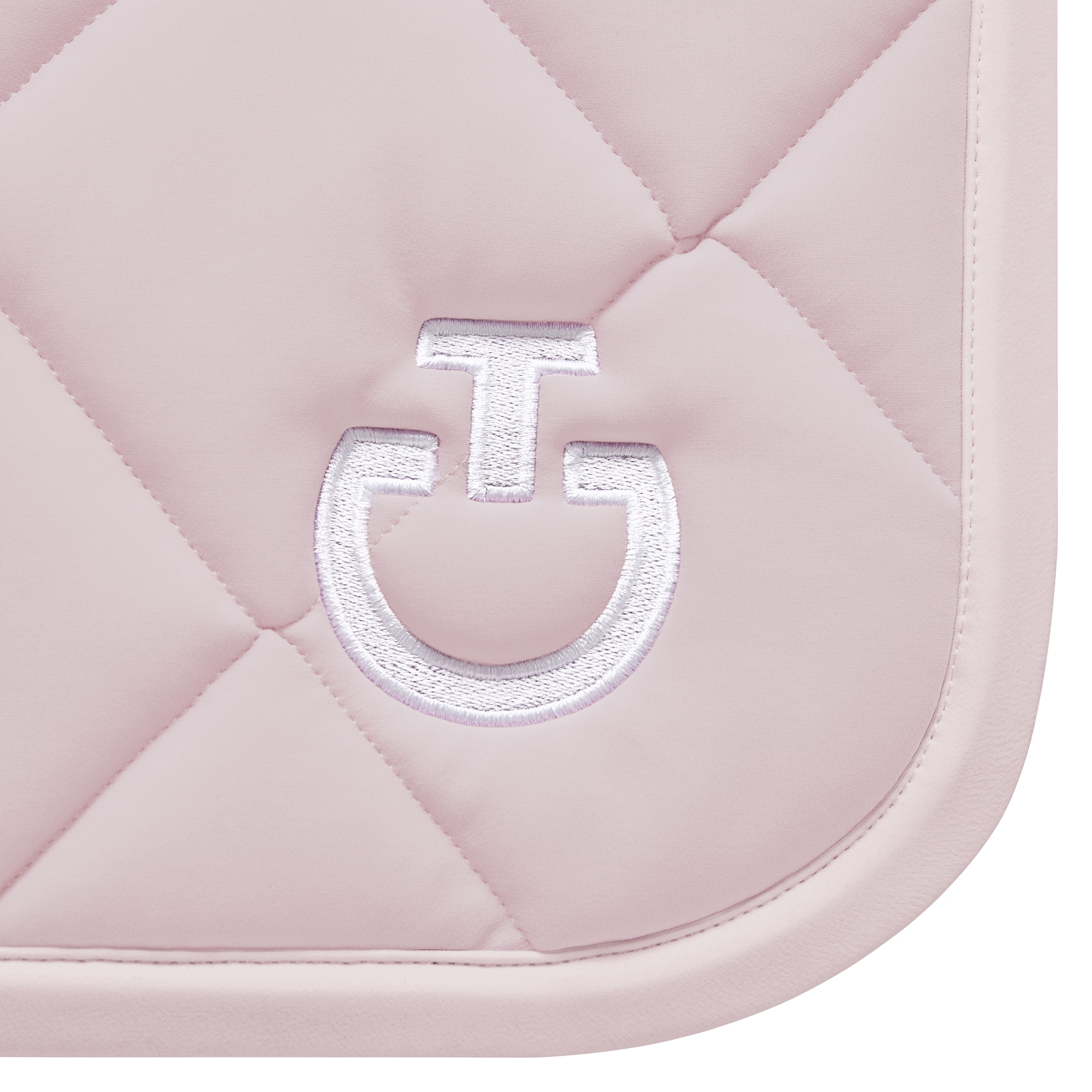 The Diamond Quilted Jersey Jumping Saddle Pad comes in a beautiful light pink color and features a white CT logo and a white channel along the back with the Cavalleria Toscana logo as well.