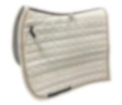 This dressage saddle pad is in the color kitt and is quilted with small squares. The saddle pad has three passpoals, brown, brown / gold / putty and brown, and it as an edge band which is tone in tone with the saddle pad's color.