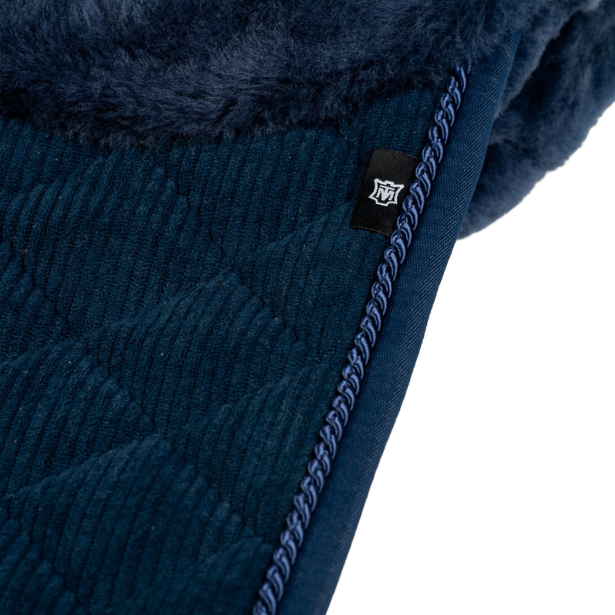 The sheepskin saddle pad comes in navy with blue sheepskin and one beautiful piping detail along the edges.