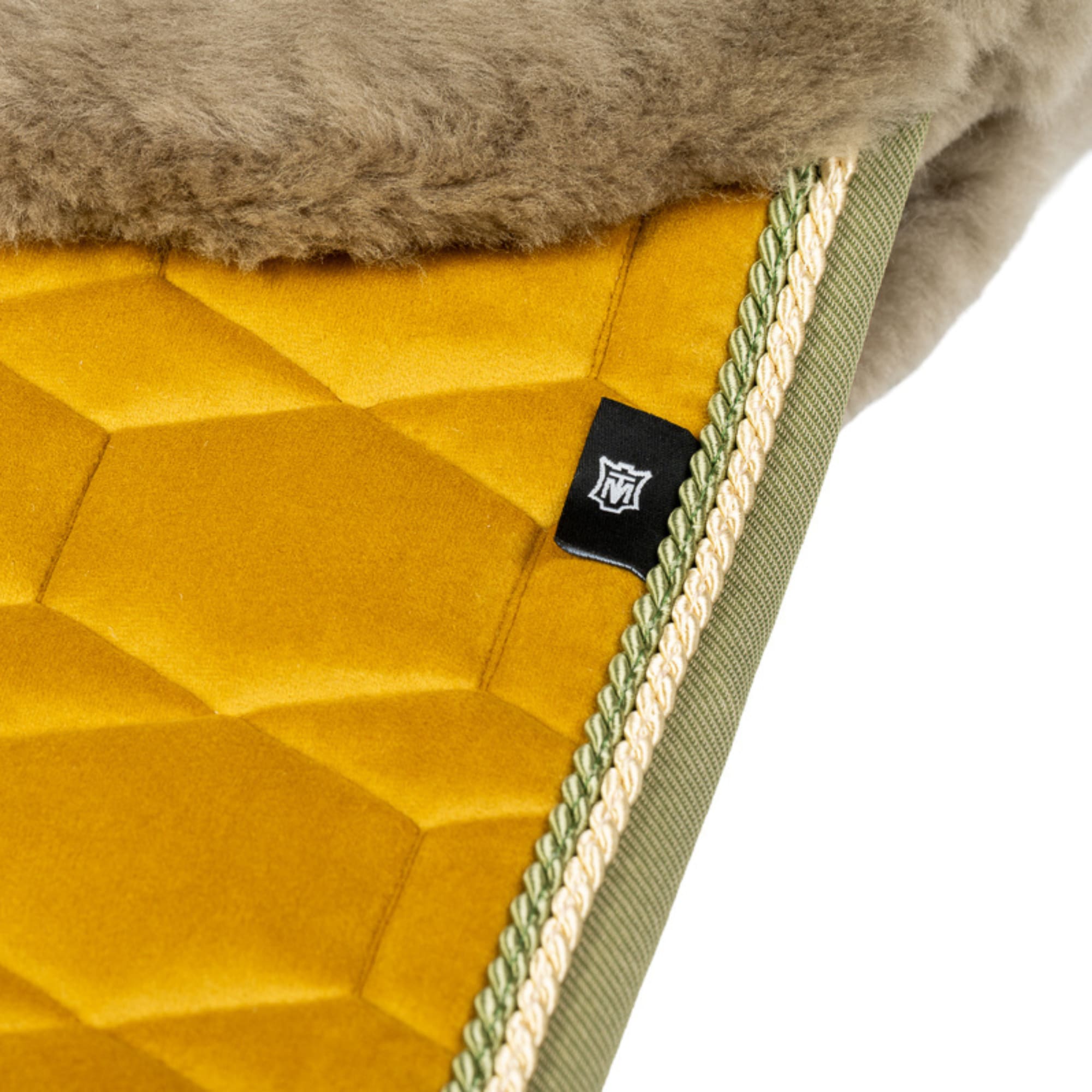 The sheepskin saddle pad comes in curry with schlamm sheepskin and two beautiful piping details along the edges.