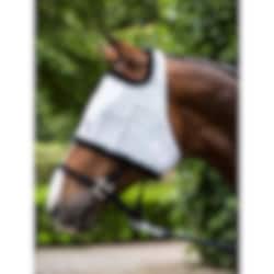 Flughuva av nät som skyddar hästens ögon mot irriterande flugor. Huvan har mjuk teddykant och brett och starkt kardborrlås. Endast Storlek XXfull.
