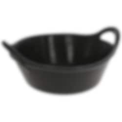 Simple bowl with carrying handle to set on the floor or in the pasture.