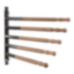 Retro style saddle pad and rug rack with five arms in a dark wood finish.