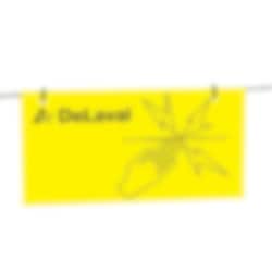 The DeLaval warning sign for electric fences is a clear safety marker indicating that the fence is electrified. The sign is made of durable plastic and has warning text on both sides, making it easily visible from multiple directions. It is easily mounted directly onto the electric wire without tools and should be placed at regular intervals so that at least one sign is always visible along the fence.