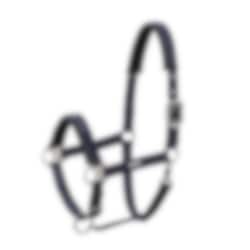 Superfin mörkt marinblå grimma tillverkad i dubbelvävd slitstark väv, mjukt fodrad över nos och nacke med fina metallspännen. Grimman är ställbar runt nos och nacke för bästa passform till din häst. Eskadron grimman har beslag i silver samt loggan på nosgrimman i silvervit ton.