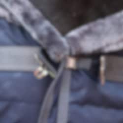 Stalltäcket har ett magnetiskt T-spänne framtill vilket håller det på plats samt gör att täcket är enkelt att sätta på och ta av, avtagbara kryssgjordar säkerställer att täcket sitter på plats även om din häst rör på sig i boxen. Kragen på täcket är av faux fur vilket bidrar med extra värme, ger täcket en lyxig look samt minskar risken för skav vid hästens manke och hals.