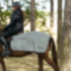 Skrittäcke GlowGuard i Reflex från Hansbo Sport är ett silverfärgat, vattenavvisande skrittäcke med mjukt fleecefoder. Reflekterande material ökar hästens synlighet vid mörka ridturer, och justerbara spännen samt svansrem ger säker och bekväm passform.