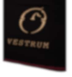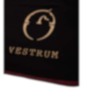 Fleecetäcket är svart med stilrena detaljer i vinrött och guld, inklusive Vestrum-logga och text på vänster sida, vilket ger ett exklusivt intryck.